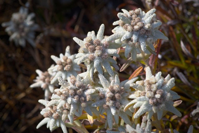 - Edelweiss – star-shaped white blooms.